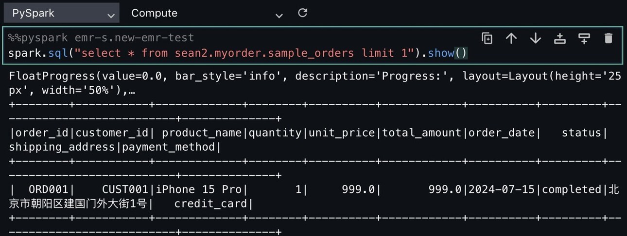 spark.sql("select * from sean2.myorder.sample_orders limit 1").show()