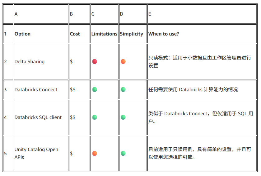 Databricks 提供了多种数据共享的方式,下面是一个列表,我们可以根据自己的需求来进行选择.