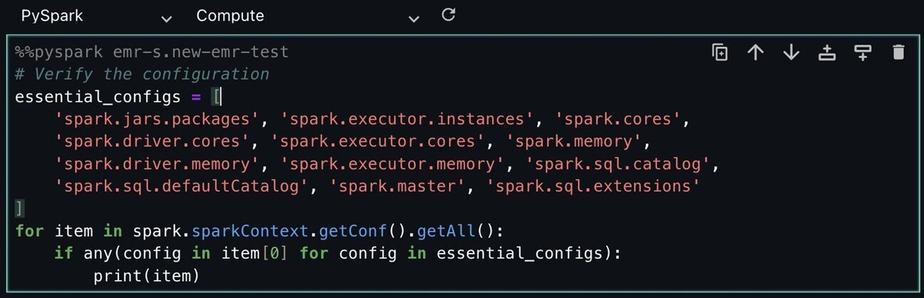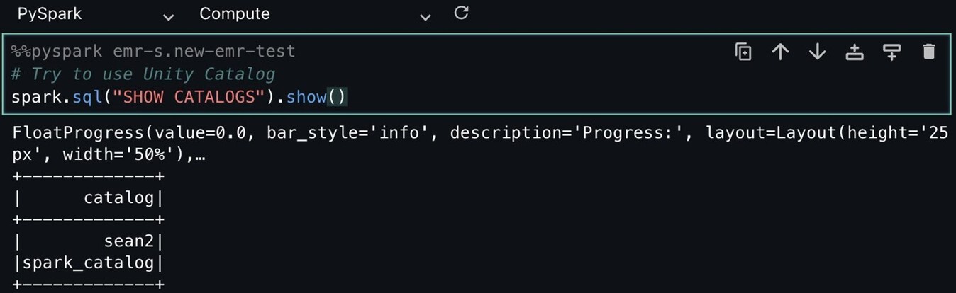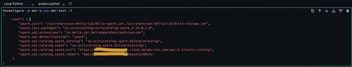 在我们创建 Sagemaker Unified Studio 的时候,会默认选上 Glue Catalog 作为 Catalog 的默认选项,如何我们想在 Notebook 内使用 Databricks Unified Catalog, 我们需要覆盖原有 Glue Catalog 配置信息,注意下面的 catalog 信息.