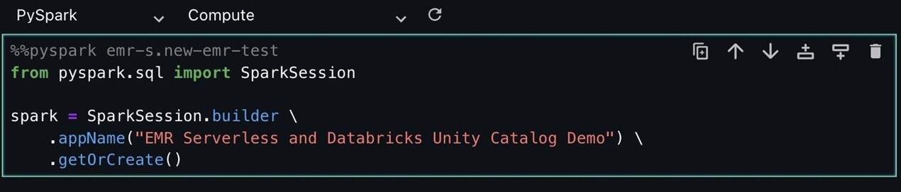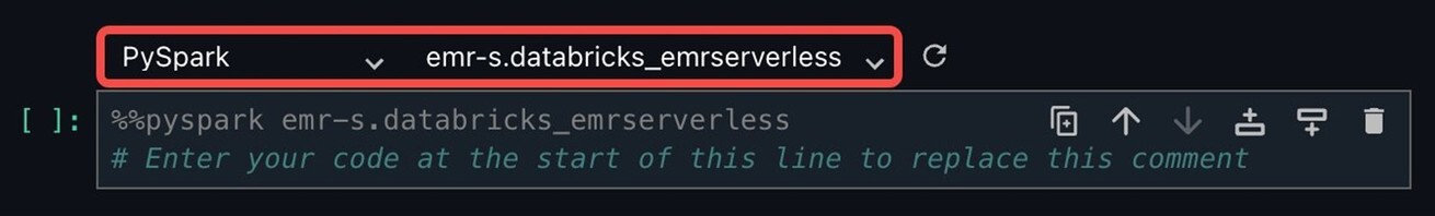 如果想使用 emr serverless 计算资源,请在每个单元格上方进行选择,左侧选择 pyspark,右侧选择创建好的 emr serverless 资源
