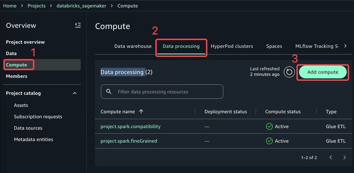 4、下一步我们来添加 EMR Serverless 计算资源。进入项目后,在左侧概览下选择 compute,点击 Data processing,点击 add compute。