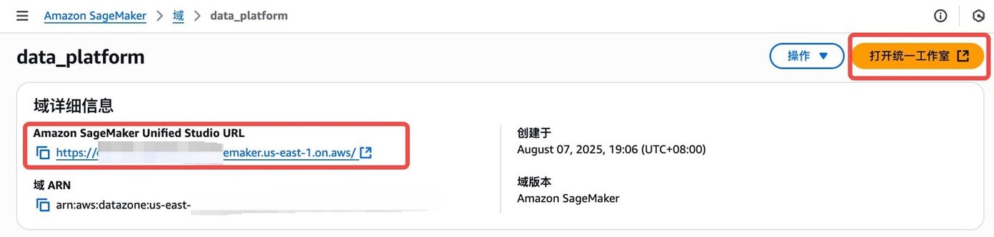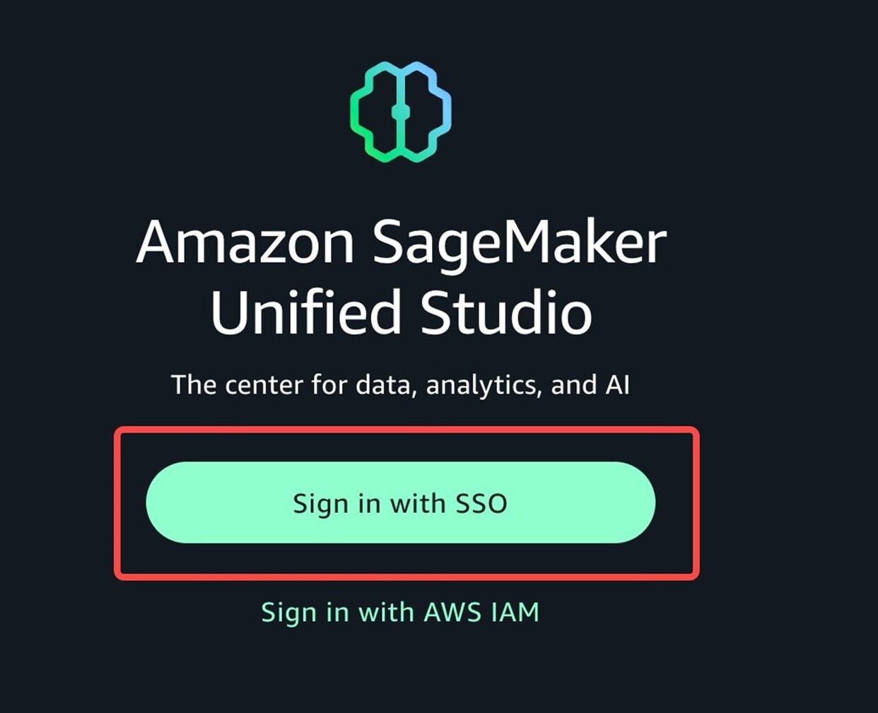 4、创建成功后通过 url 或者“打开统一工作室”按钮登陆 Amazon SageMaker Unified Studio。点击后选择 SSO 方式登陆。输入在 IAM 身份中心设置的用户名和密码。