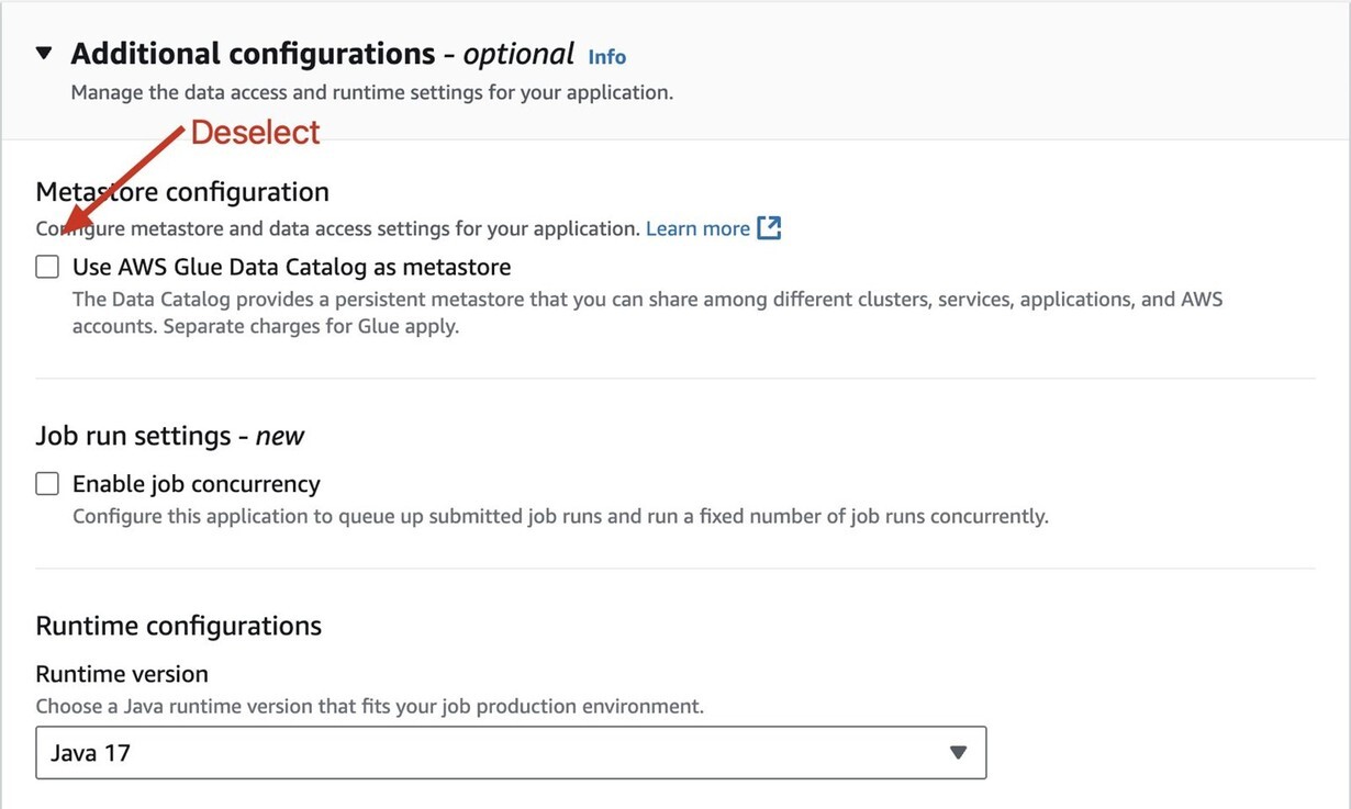 下面我们需要修改 EMR Serverless Application 的配置, 为了保证后面我们在 Sagemaker Unified Studio 中的配置一致,我们需要修改 Application 的 Application configuration 和 Additional configurations. 修改的内容如下