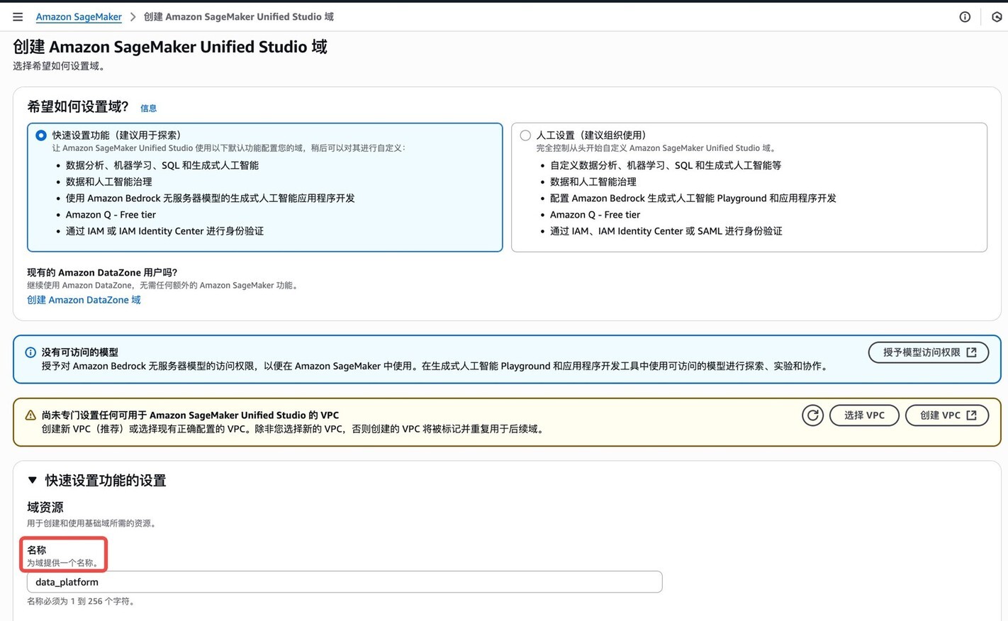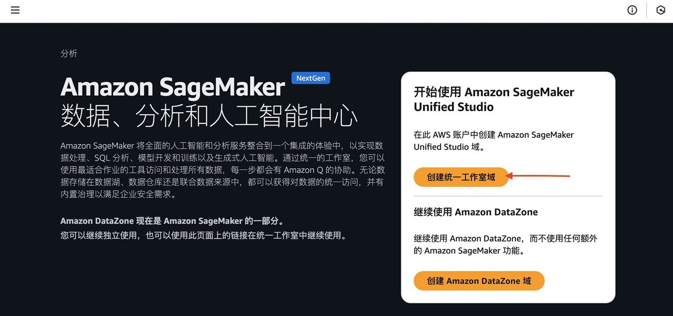 1、要开始创建域,请在 Amazon SageMaker 控制台上点击 创建统一工作室域按钮。