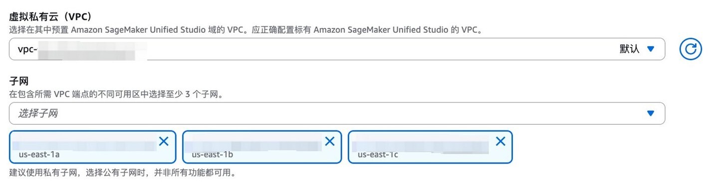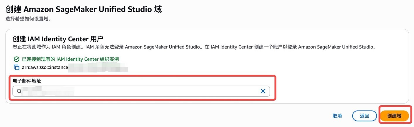 3、Amazon SageMaker Unified Studio 域默认支持 IAM 用户身份验证。在此输入 IAM Identity Center 中用户电子邮箱地址。