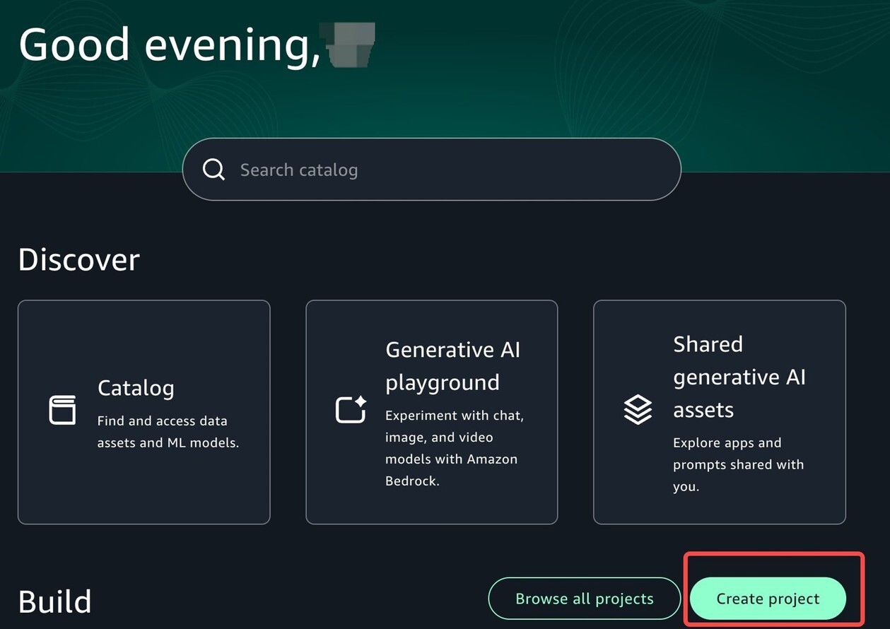 1、登陆后点击创建项目,在 Amazon SageMaker Unified Studio 中,通过项目汇集人员、数据和工具,使数据用户群体能够协作解决特定的业务用例。