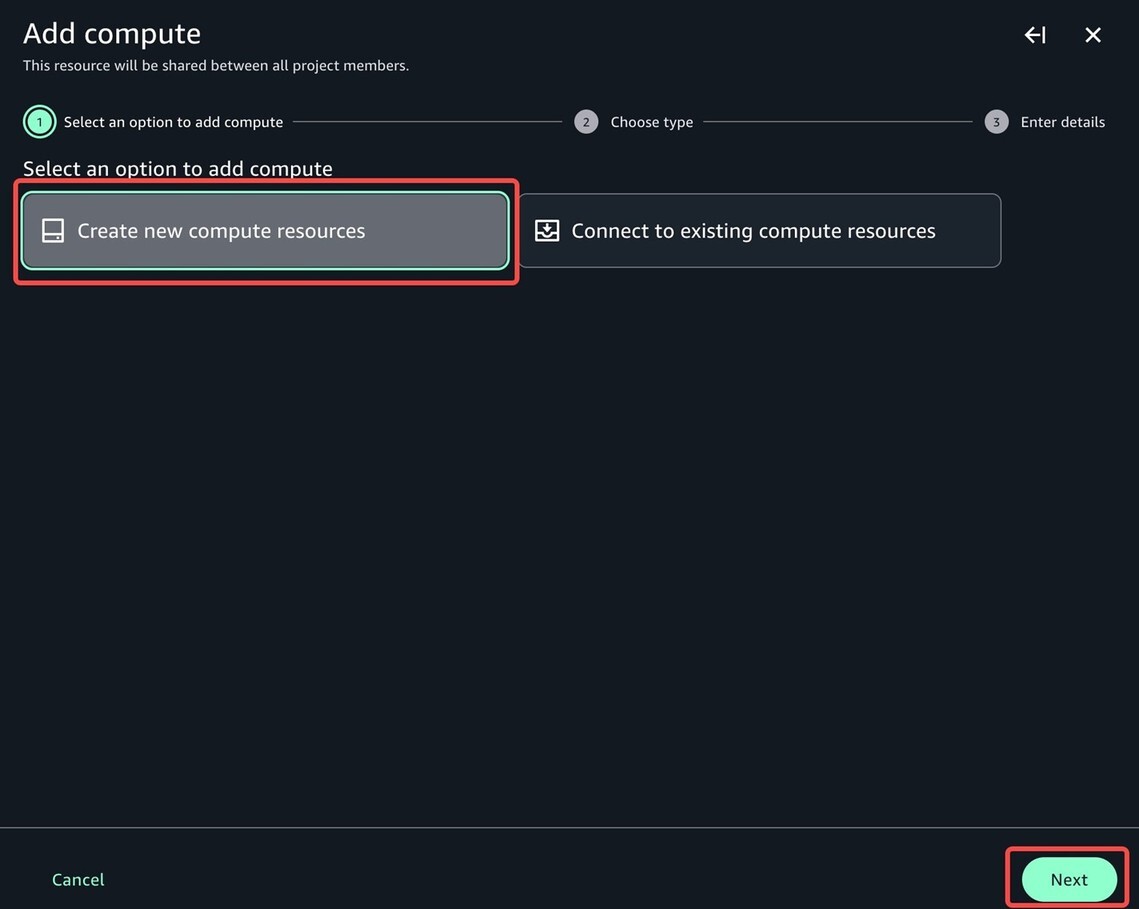 5、您可以选择连接到现有计算资源。如果您为创建资源,可以选择 Create new compute resources,点击 next