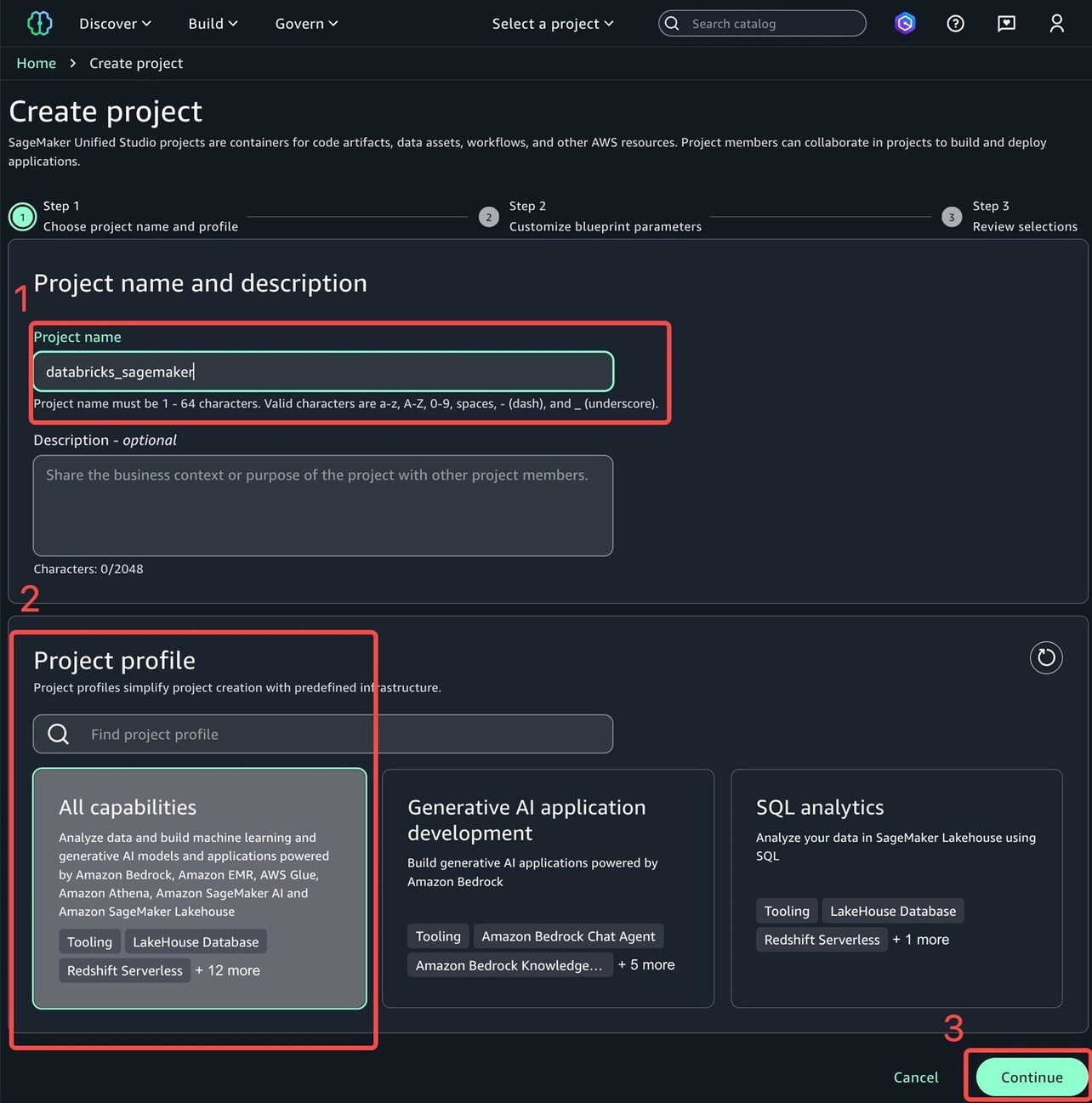 2、修改项目名称,选择合适的项目配置文件。项目配置文件是用于创建项目的配置蓝图的集合。蓝图定义了项目成员在处理 Amazon SageMaker 目录中的数据时可以使用哪些亚马逊云科技工具和服务。这里选择的是所有功能,选择后点击继续。