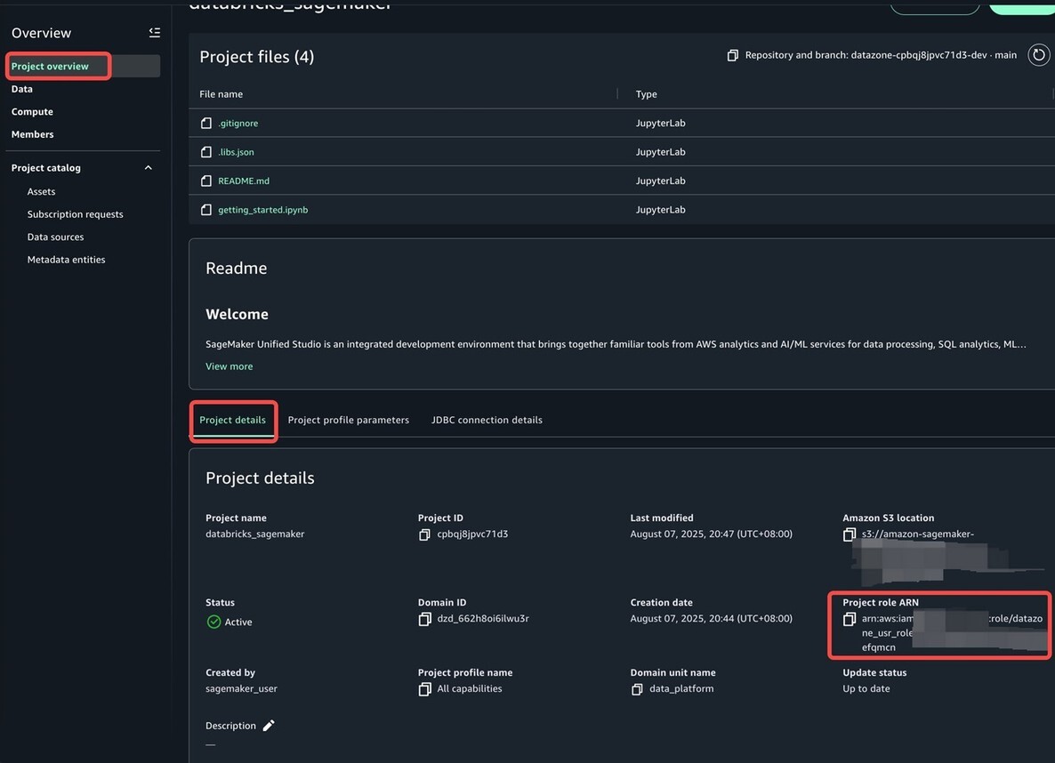 1、我们先在左侧概览下选择 Project overview,在 Project details 找到 Porject role arn,从 datazone_user 字段开始复制