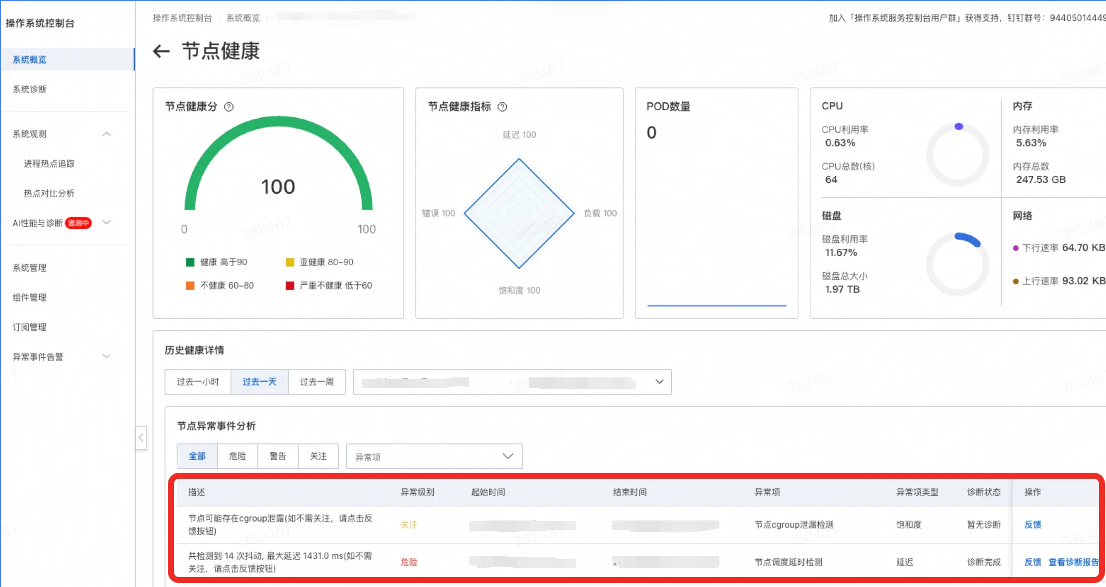 2. 通过操作系统控制台的节点异常详情,我们可以看到发生了调度抖动异常和 cgroup 泄漏异常: