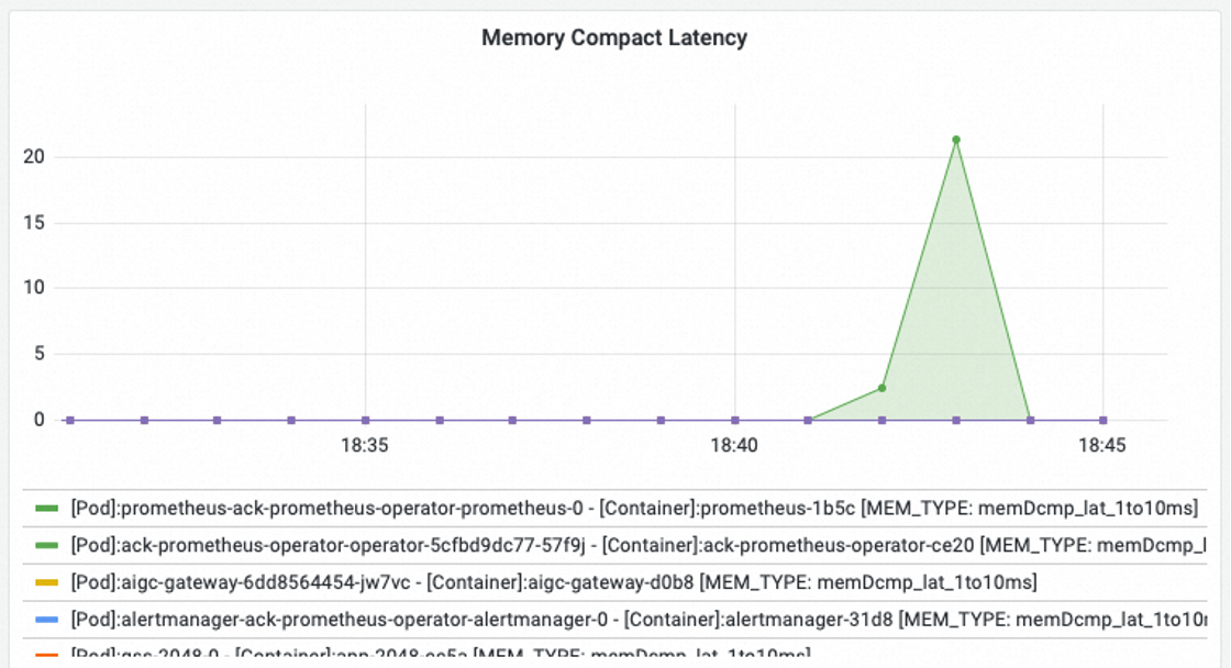 查看 SysOM 容器系统监控-容器维度中的 Pod Memory Monitor 中的 Memory Global Direct Reclaim Latency 和 Memory Direct Reclaim Latency 和 Memory Compact Latency 监控大盘,可以直观地观察到 pod/ 容器中的进程因为发生直接内存回收和直接内存规整而被阻塞的时长。