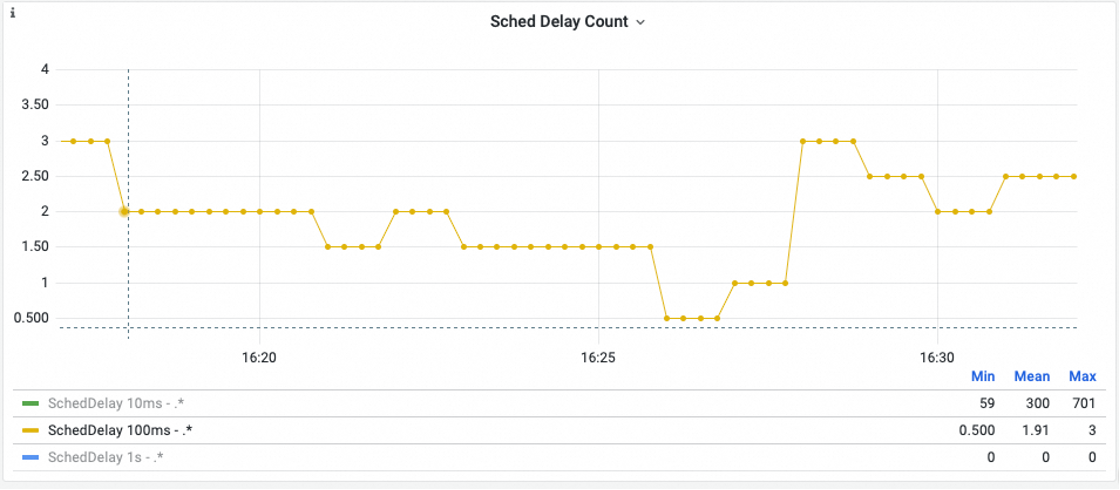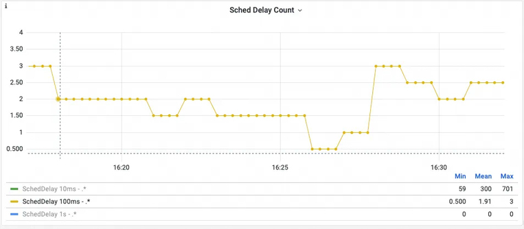 1. 通过查看网络抖动应时间的 Sched Delay Count 大盘,可以看到在对应的时间点中,伴随着多次 1ms 以上的 sched delay,这说明了系统中这个时间点发生多次某个 CPU 不发生调度 500ms 以上,那么很有可能 ksoftirq 得不到调度从而引发了网络延时抖动。