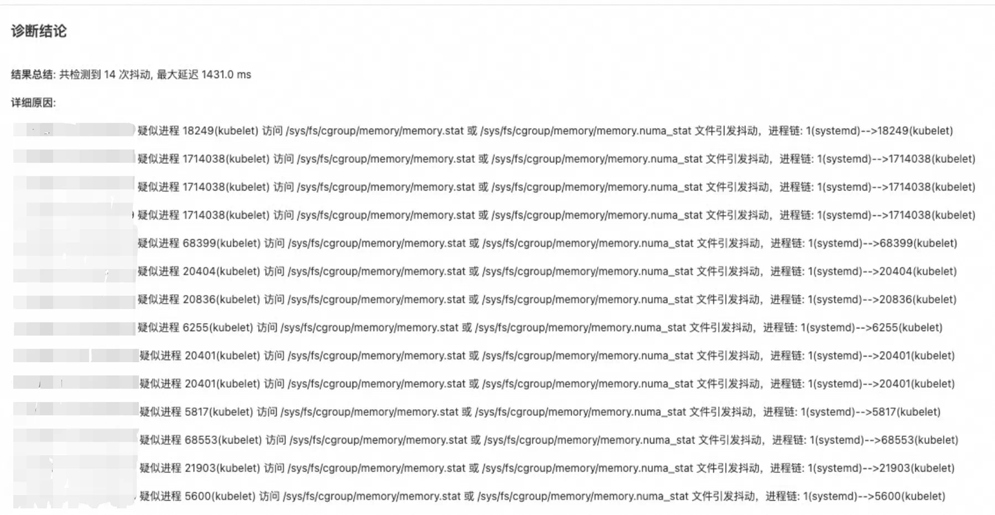 4. 结合抖动诊断和 cgroup 泄漏异常基本可以确定是 memory cgroup 泄漏且 kubelt 访问 memory cgroup 的 memory.numa_stat 文件时,由于 numa_stat 中的数据在 Alinux2 内核中多次遍历 cgroup 层级导致调度抖动进而影响 softirq 收包。