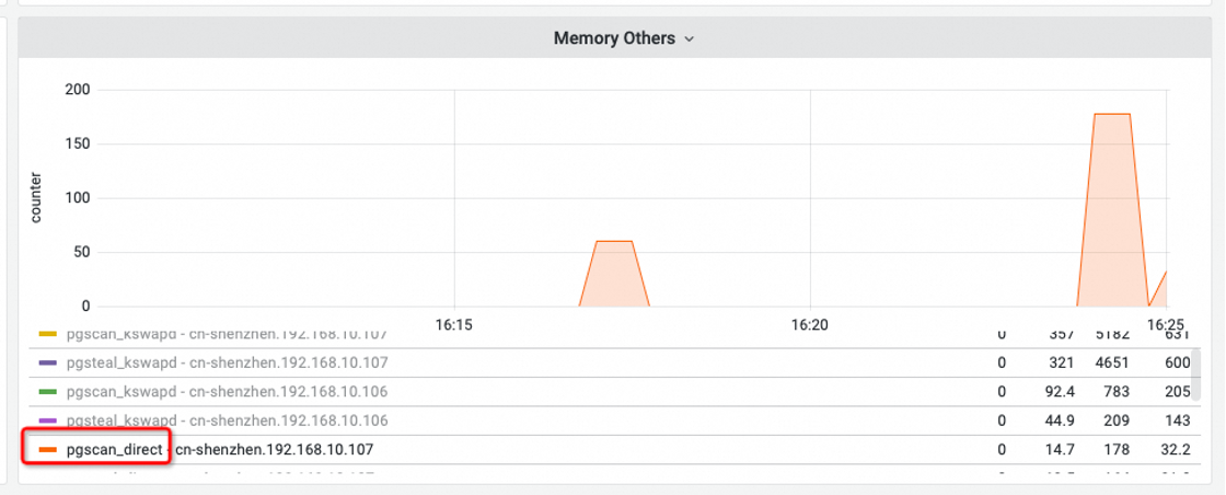 该大盘中的 pgscan_direct 折线表示节点中在直接内存回收阶段扫描的页数,只要该折线的数值不为 0,说明在节点中发生了直接内存回收。