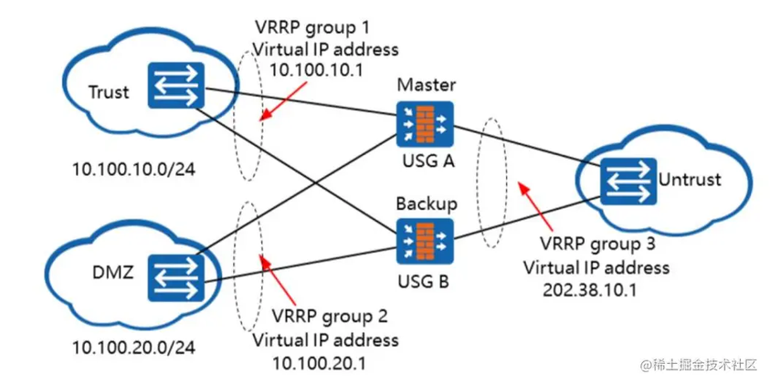 以下是一个常见的 VRRP 配置示例,假设我们有两台华为路由器(RouterA 和 RouterB),它们连接到相同的网络并提供冗余服务: