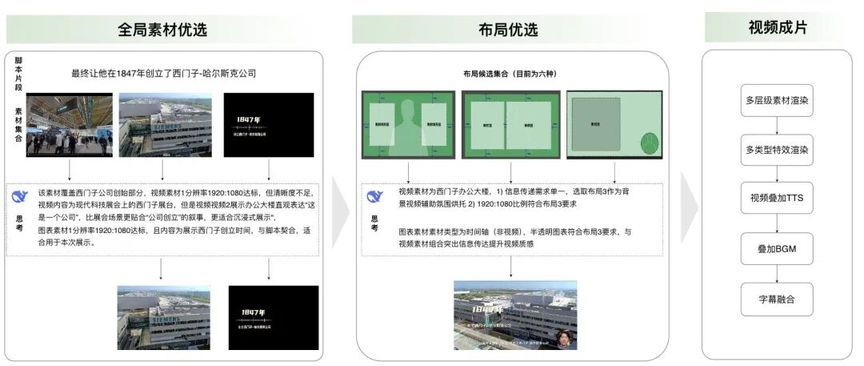 通过大模型多轮规划推理,进行素材/布局/动效/音效等多视频元素全局优选,完成最终视频剪辑并成片。整体流程如下: