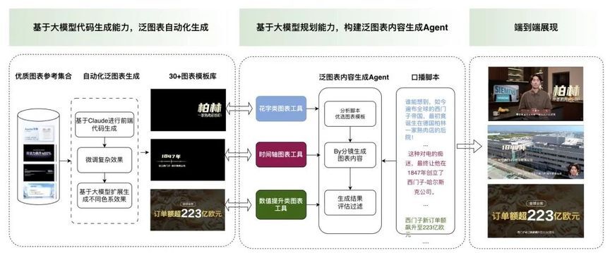 泛图表生成,进一步增加差异化供给: 基于大模型代码生成能力,自动化构建 30+个泛图表模板,并通过 MCP 形式对外开放;通过大模型规划能力,根据脚本选择最优图表模板并生成泛图表内容,端到端图表生成可用率达 92%。