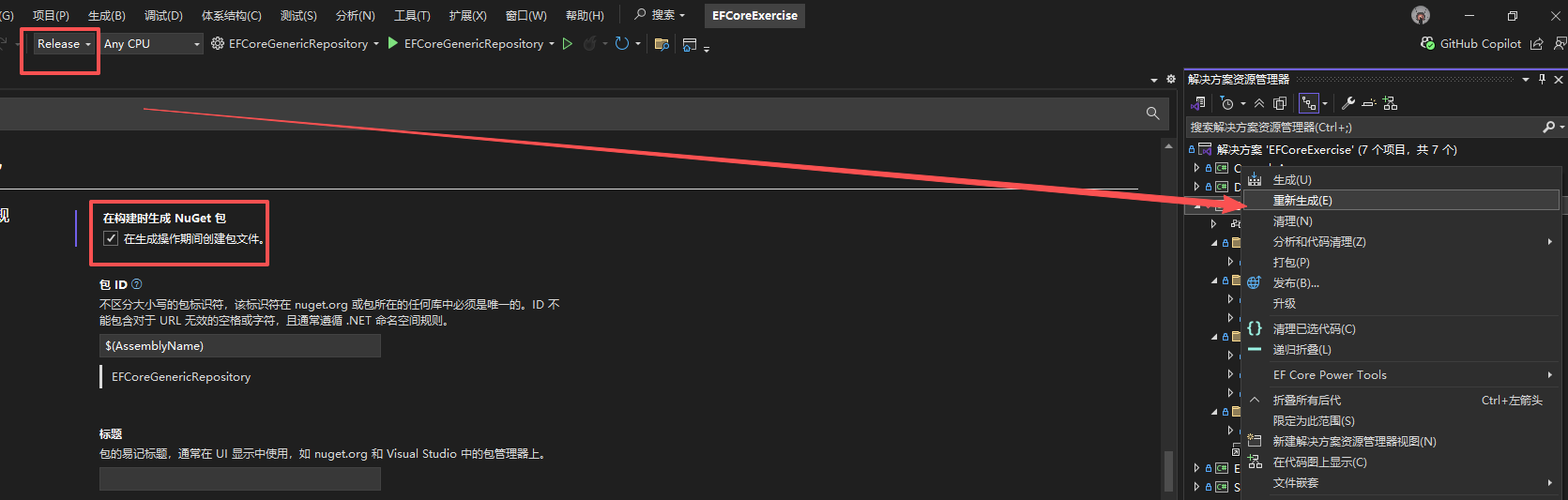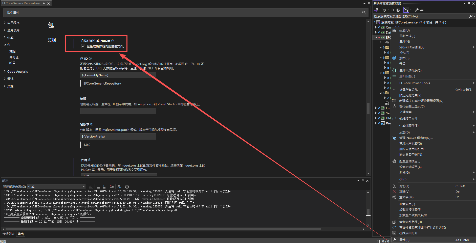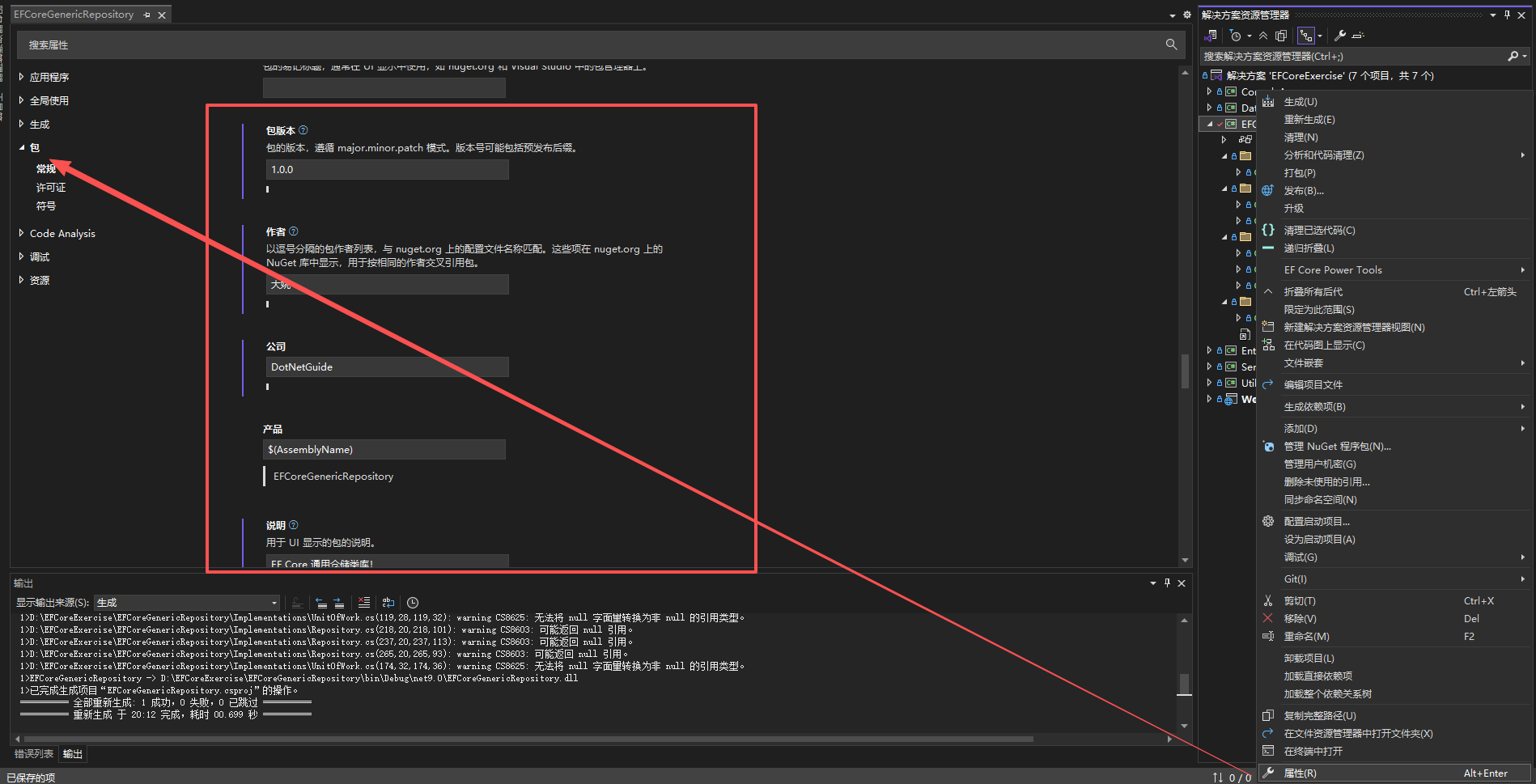 EFCoreGenericRepository 类库 => 属性 => 填写相关包的配置信息:
