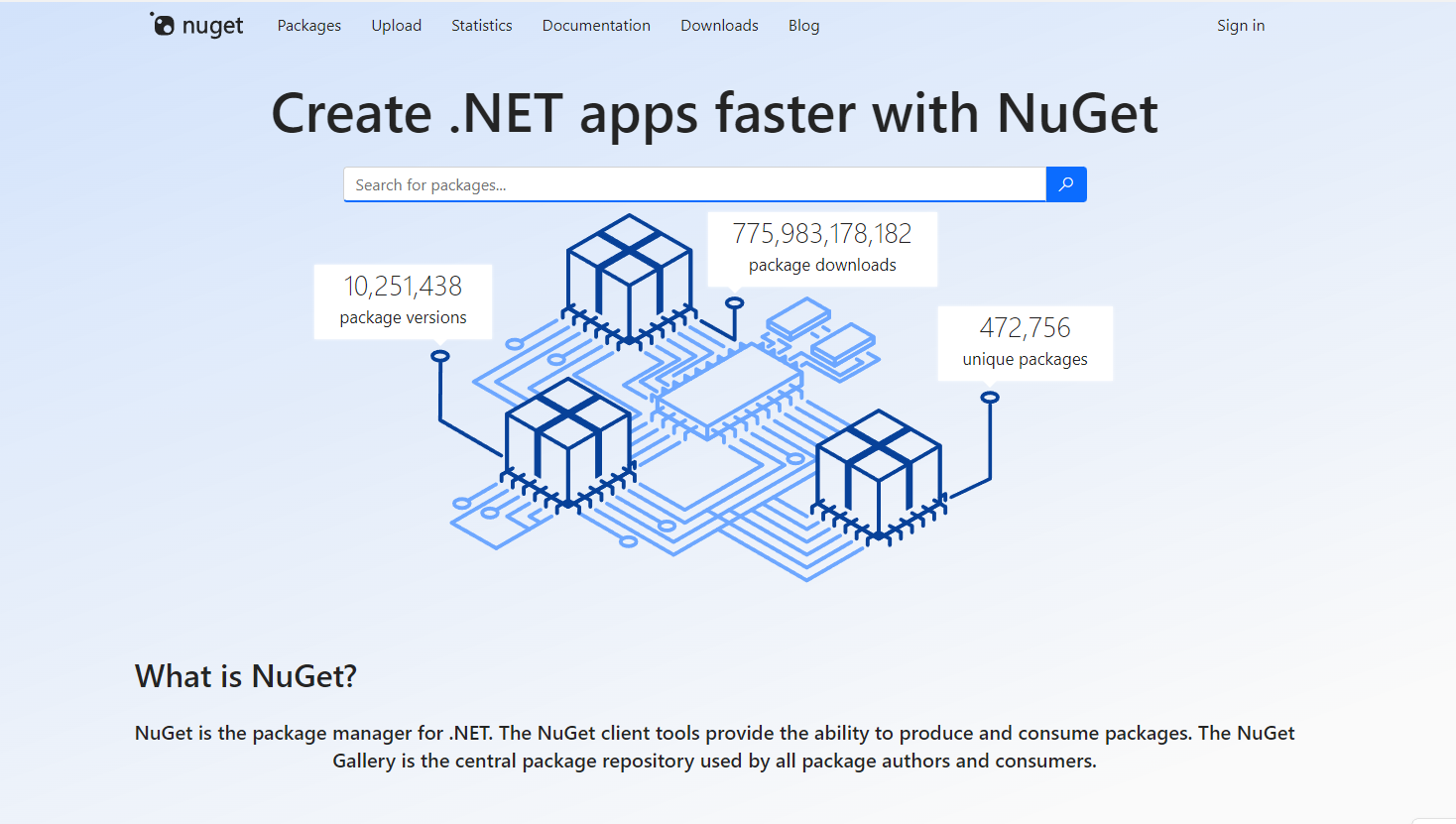 NuGet 包是具有 .nupkg 扩展的单个 ZIP 压缩文件,此扩展包含编译代码 (DLL)、与该代码相关的其他文件以及描述性清单(包含包版本号等关键信息)。使用代码的开发人员共享创建包,并将其发布到公用或专用主机。包使用者从适合的主机获取这些包,将它们添加到项目,然后在其项目代码中调用包的功能。在此过程中,NuGet 会自动处理所有底层依赖和安装细节。