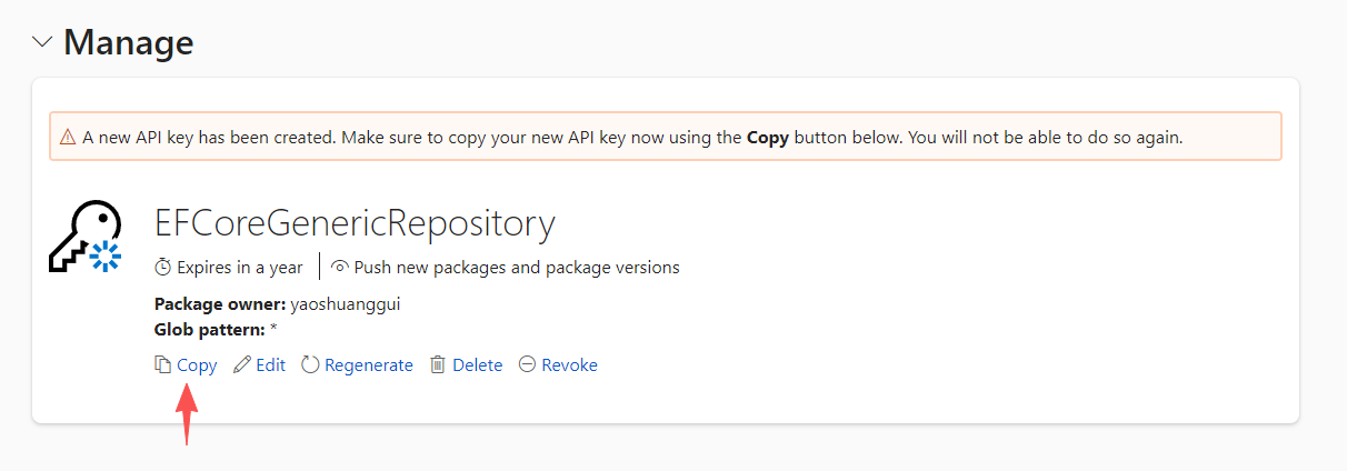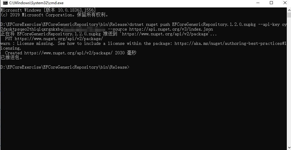在包含 .nupkg 文件的文件夹运行以下命令。指定 .nupkg 文件名,并将密钥值替换为 API 密钥。