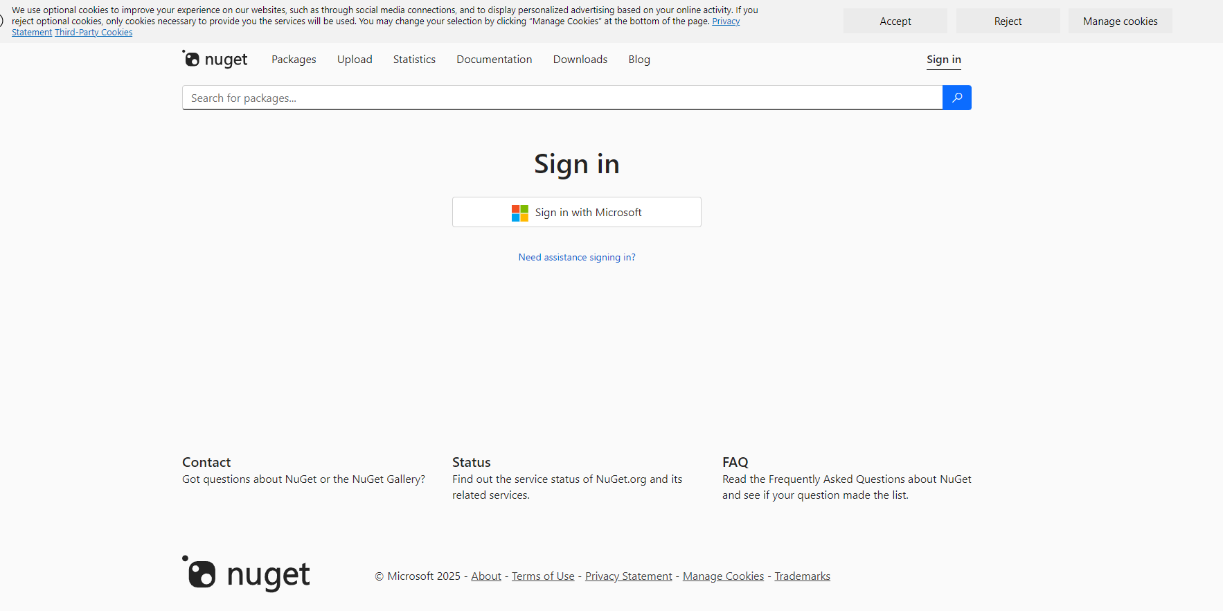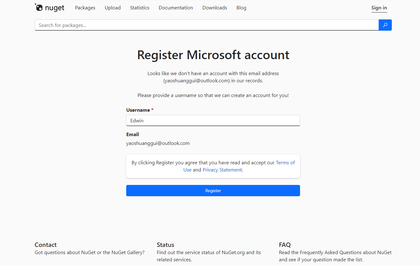 必须注册个人帐户才能在 NuGet 官网(https://www.nuget.org