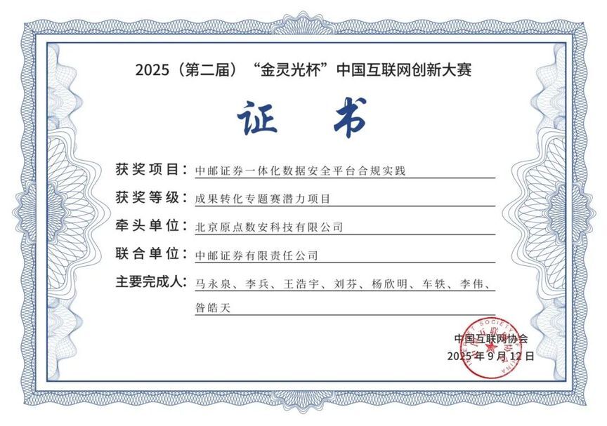 近期,由中国互联网协会主办的 2025(第二届)“金灵光杯”中国互联网创新大赛落下帷幕。本届大赛共设置 11 个专题赛 13 个方向,涵盖 AI+ 创新应用、低空经济创新与应用、数字政府、数据要素、数字教育、算力创新应用、合规科技、数智监督、信息技术应用创新、信息通信安全、成果转化等方向,吸引了 1012 家单位报名参赛,提交参赛项目数量达 1556 个。原点安全申报的“中邮证券一体化数据安全平台合规实践”项目获得成果转化赛道潜力项目奖。