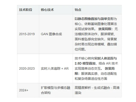 从 2015 年开始,行业内开始探索 AI 试穿技术的落地应用。早期以 GAN 图像合成技术为核心,通过静态图像叠加与简单变形实现试穿效果,存在无法模拟肢体动作、服装褶皱与面料垂坠感缺失等局限;中期转向实时人体追踪与 AR 技术结合的 2.5D 模型动态叠加方案,虽实现了基础动态交互,但在服装真实感、复杂动作适配性上仍有不足;