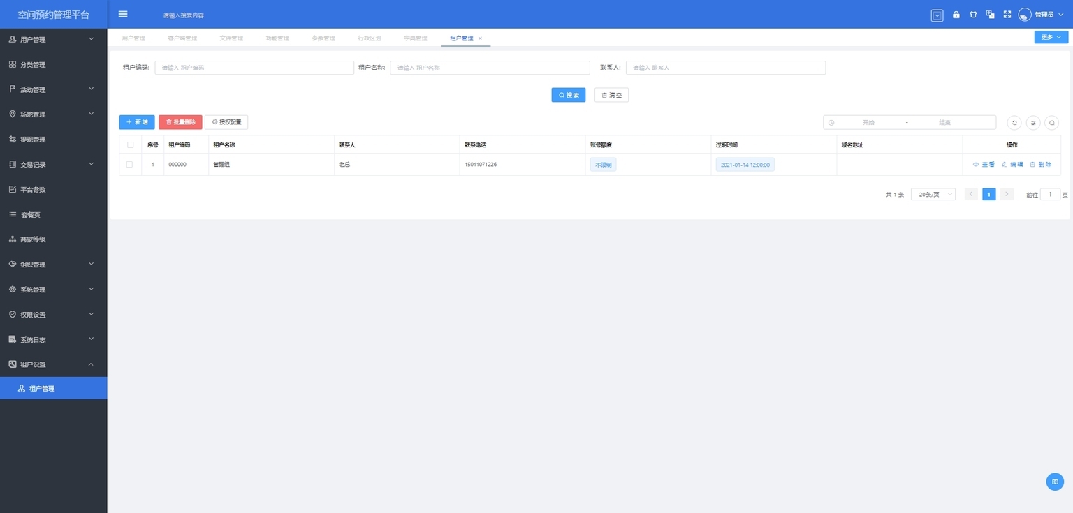 租户设置:管理租户账户,包括租户信息的创建、编辑、删除,以及租户的权限和访问控制,确保租户数据的隔离和安全性,适配多租户运营场景。