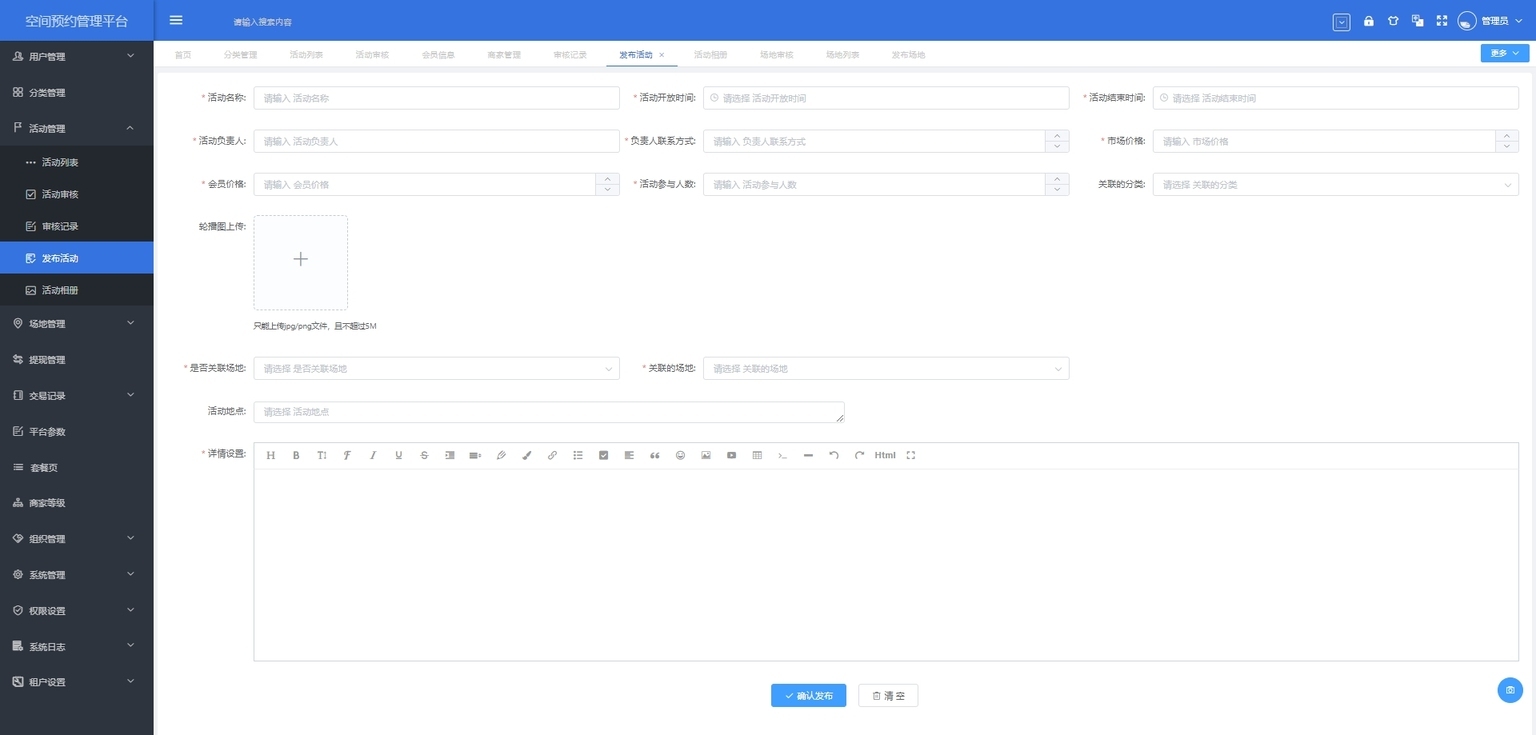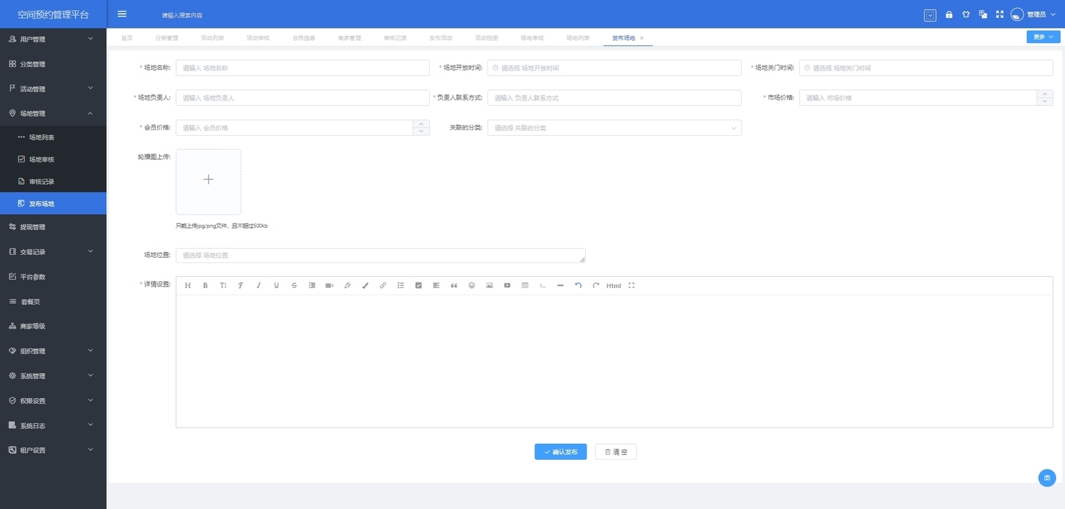 发布场地:允许用户发布新的场地信息,包括场地的详细描述、图片上传、价格设置等,支撑场地资源的动态更新与发布。