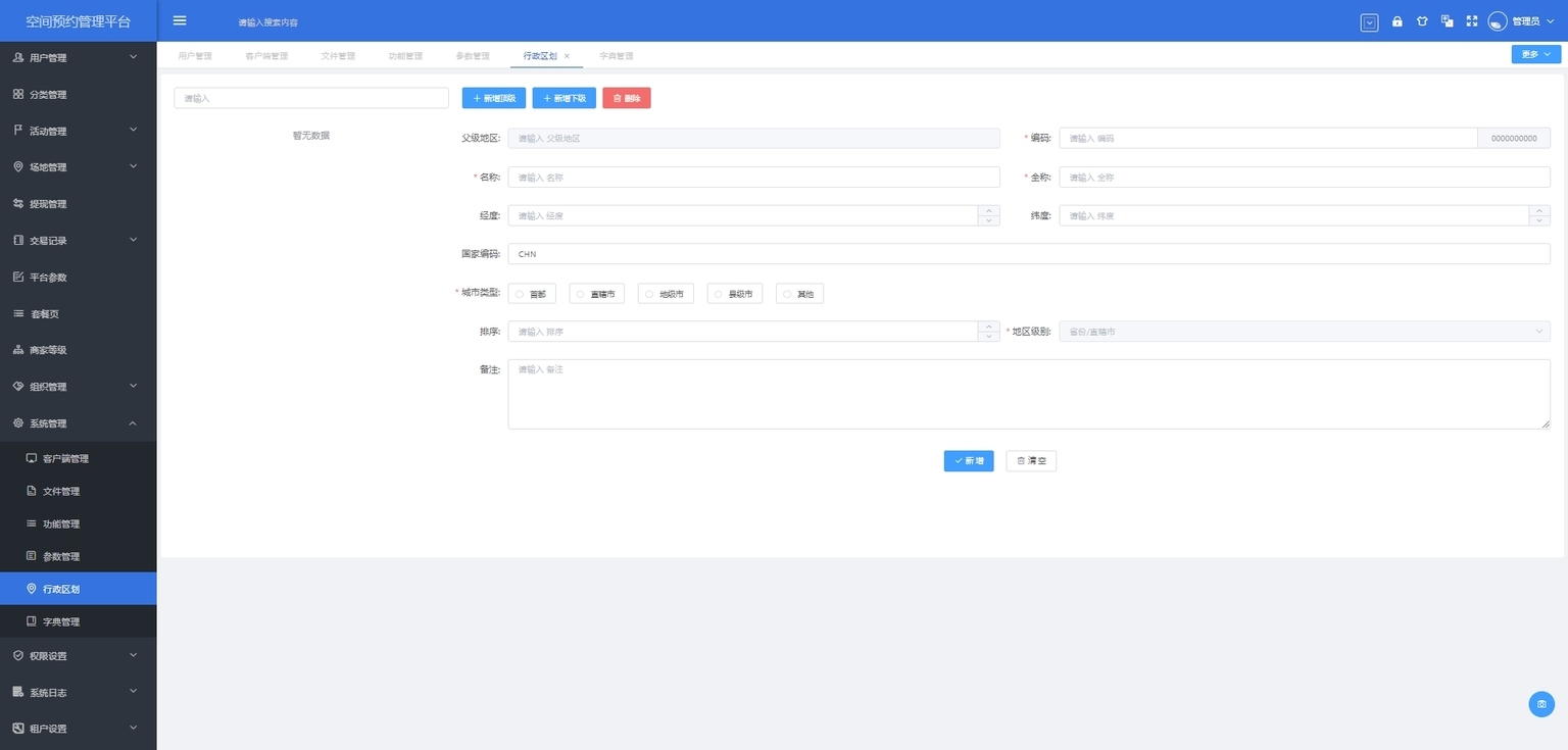 行政区划:管理行政区划信息,包括地区划分、地址管理、地区属性等,以支持地理位置服务和区域业务管理,保障场地与活动的地理维度管理。