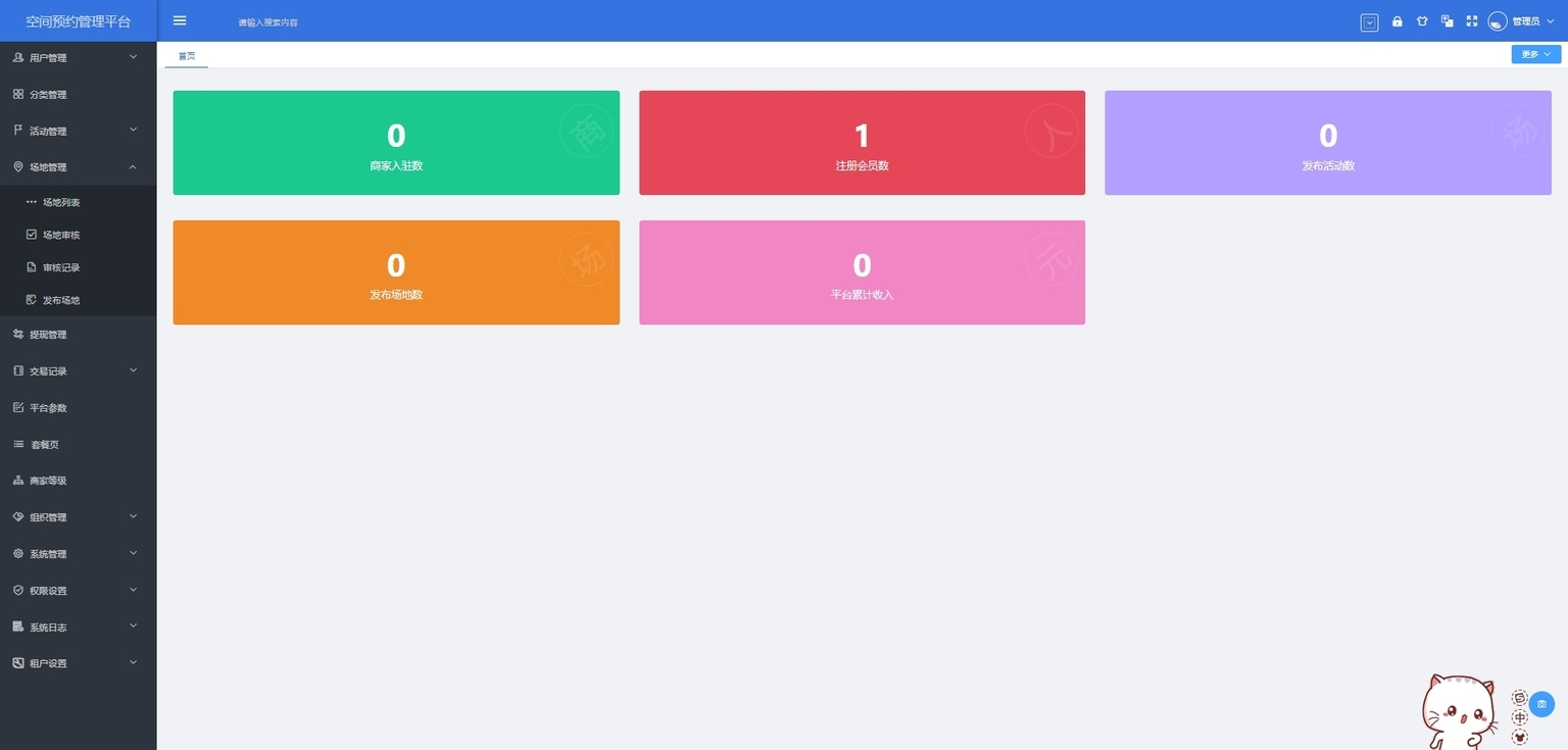 作为系统主界面,包含系统的概览、最新通知和统计数据等,为场地管理工作提供全局信息与操作起点。