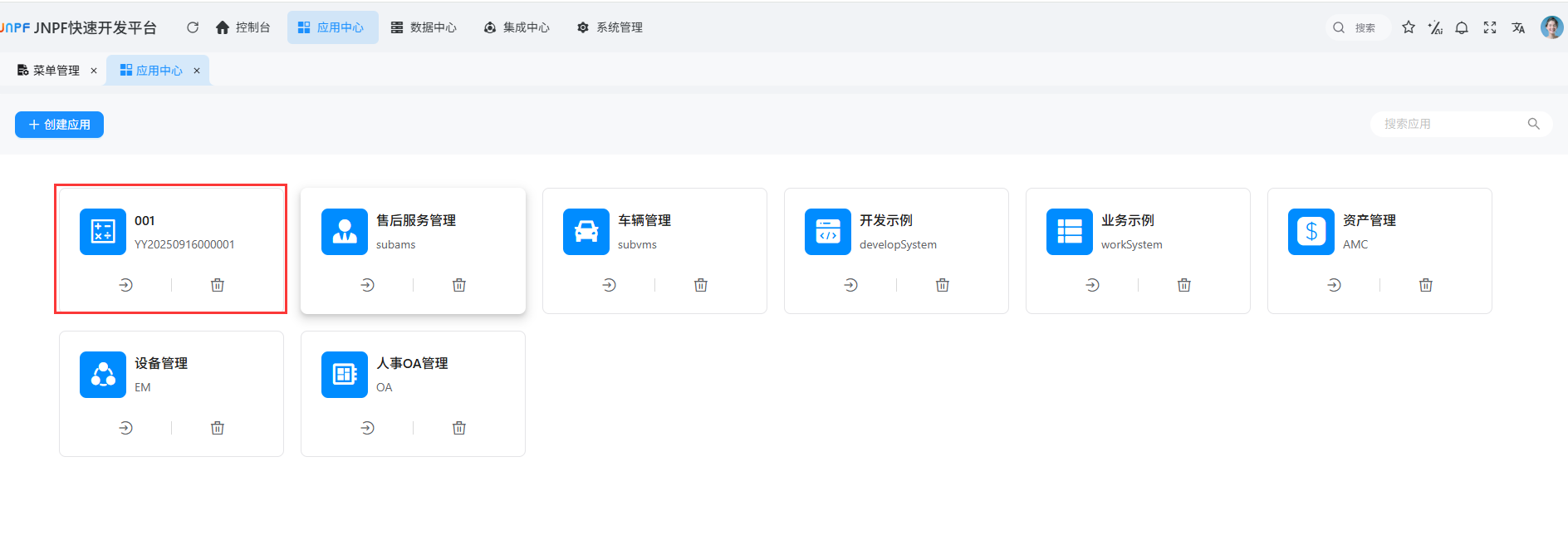 先进入应用中心:从控制台点击 “应用中心”,在应用列表中找到需要修改的应用(比如 “001” 应用),点击应用图标 —— 这一步是关键,只有点击图标才能进入应用后台,不是点击 “访问应用”(后者是进前台);