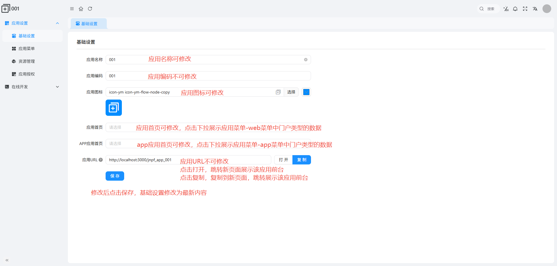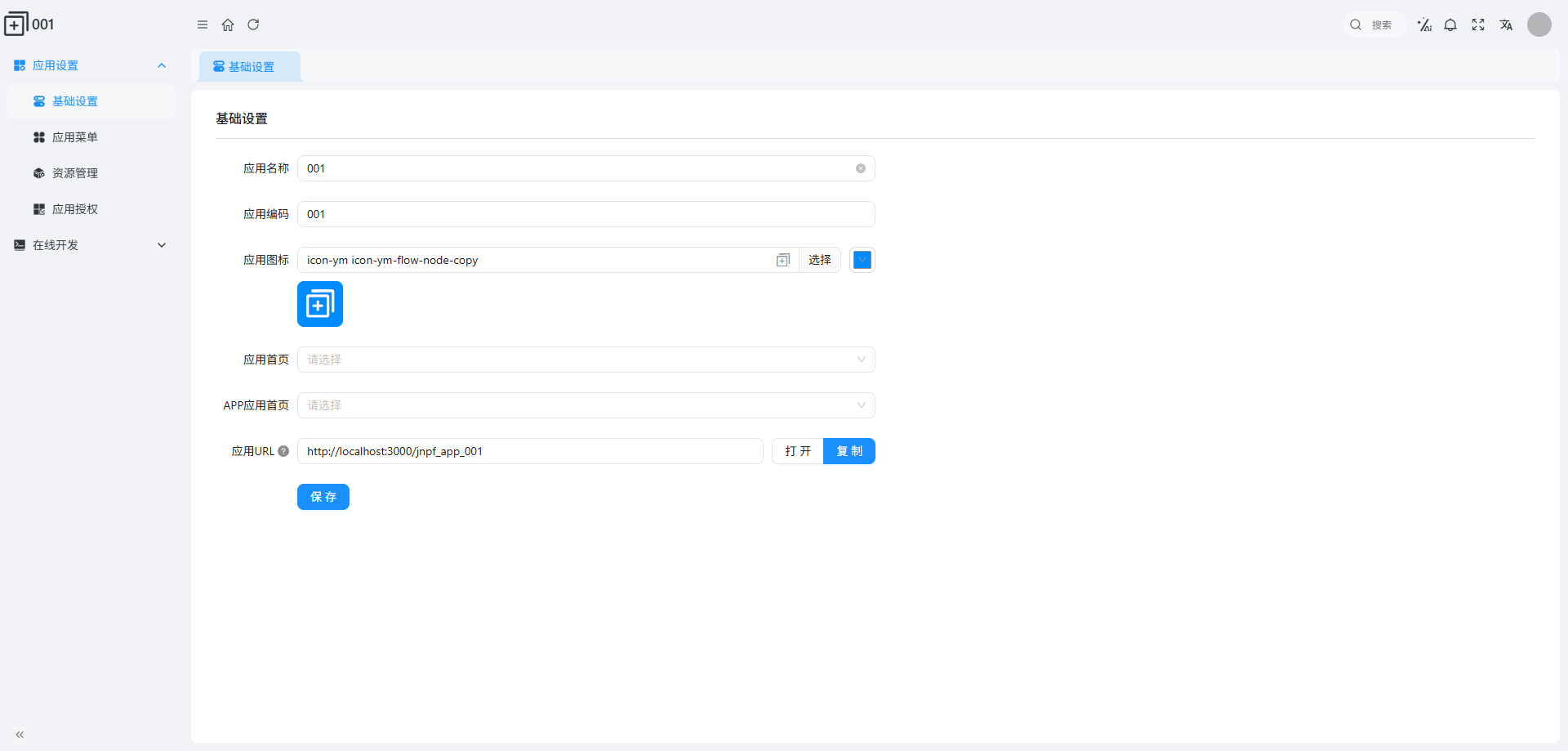 应用 URL:比如 “http://localhost:3000/jnpf_app_001”,URL 由应用编码自动生成,仅支持 PC 端访问,APP 端不支持,也不能手动修改。