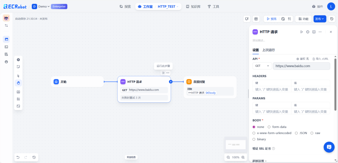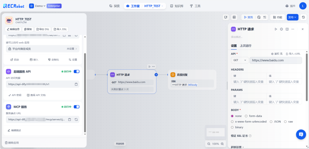 对于私有 API 或⾏业特定接⼝,Dify 的 HTTP 节点让集成变得异常简单。只需配置 API 的端点、调⽤参数和认证信息,Dify 便能调⽤各种系统的 API。这意味着开发⼈员能快速将有暴露 API 的 CRM、ERP 等系统快速集成到 AI 应⽤中。