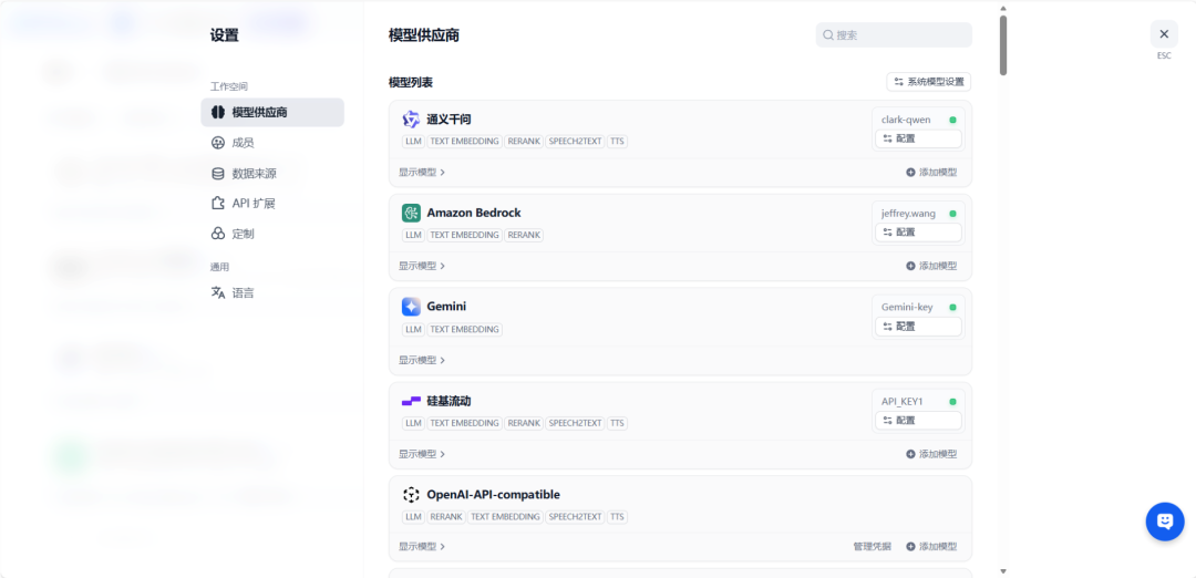 在 Dify 中添加新的模型服务通常只需⼏个简单步骤:进⼊模型设置界⾯,选择提供商类型,输⼊ API 密钥和端点 URL。直观的操作界⾯让原本需要数⼩时的集成⼯作,缩短到⼏分钟即可完成,真正消除了复杂的编码需求。