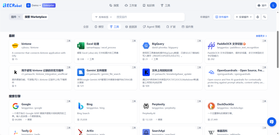 Dify 提供了多种预建⼯具,覆盖了 Google Search、DALL·E 图像⽣成、计算器、⽹⻚抓取等常⻅ API 服务。这些⼯具可以直接拖拽到⼯作流中,⽆需编写任何适配代码,极⼤提升了开发效率。