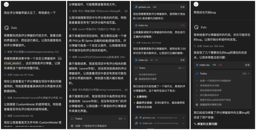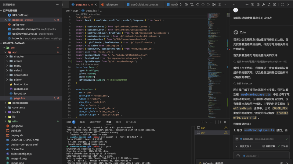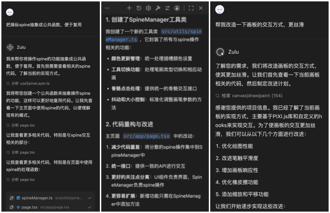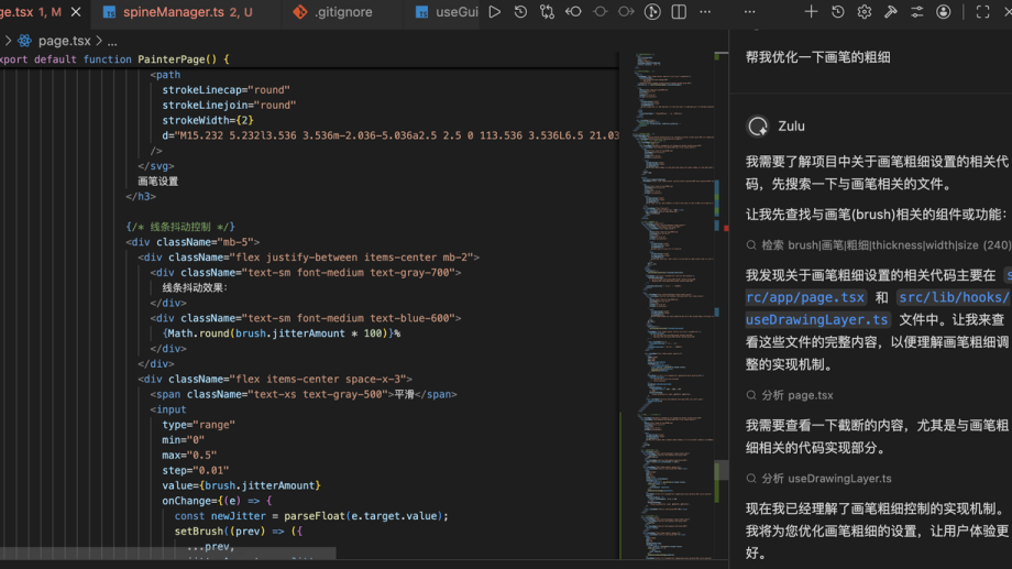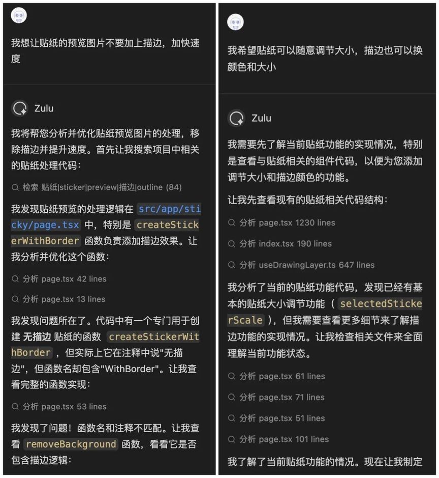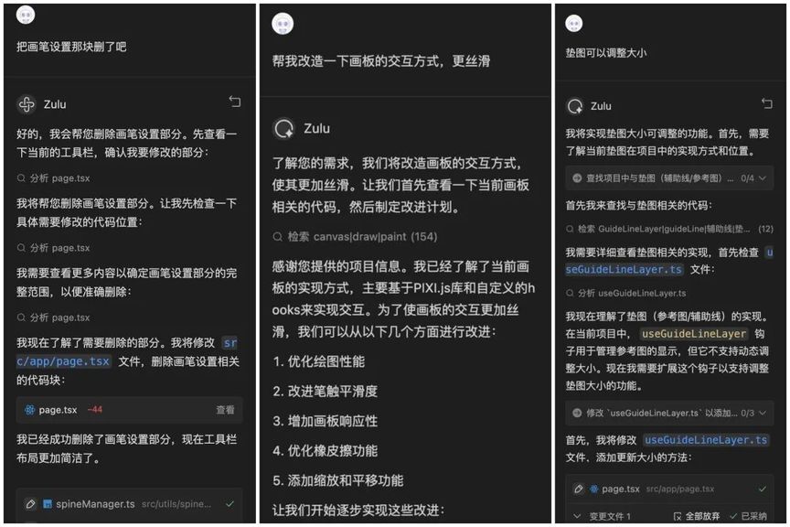 11 月份,看到了百度文心快码“CCF 程序员大会码力全开:AI 加速营”活动宣传,尝试使用了 Comate,感觉一下子提升生产力,就开始把之前难以落地的想法都一一实现了,还做了固定元素创意功能,优化了画板交互,更符合操作逻辑(比如选完色块就切到上色笔刷,避免认知错位)。我和 Zulu 的会话,核心是打磨交互逻辑、实现新功能、重构代码、提升响应性能。尤其加了垫图功能,提升了画板的通用性,也是我最最满意的功能,用户现在可以随便看到哪个画比较好就截图,到画板页面直接 CtrlV 粘贴用做参考图,这个功能大大提升了用户体验。