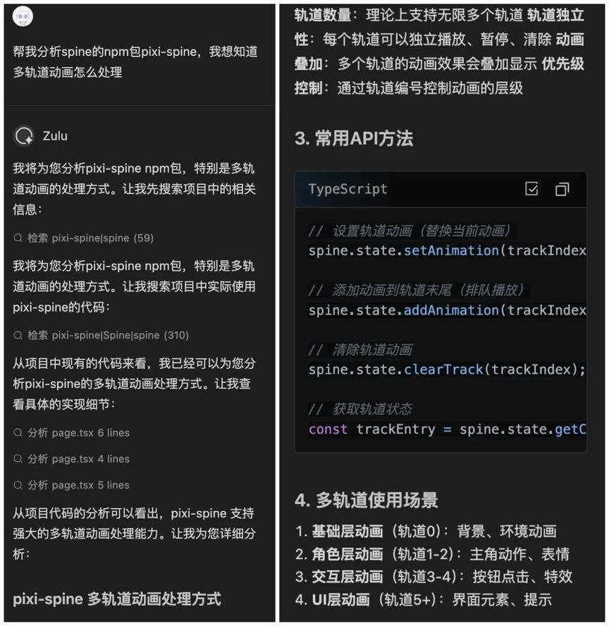 询问 Comate 多轨动画处理方式,Comate 列出了 API 方法