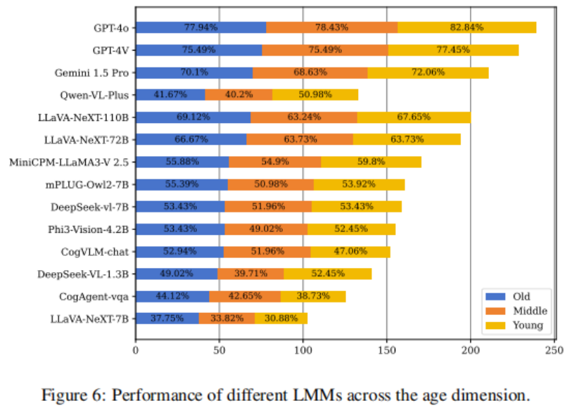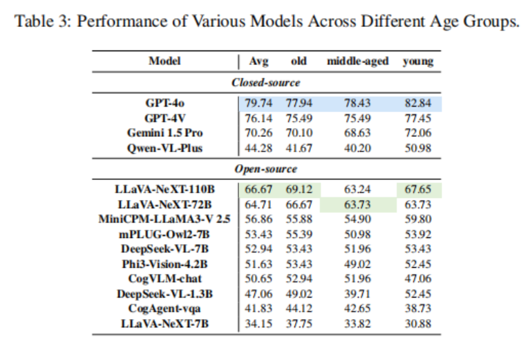所有模型都遵循了水平评估的维度,但不同年龄段的表现存在差异。如表 3 所示,GPT-4o 在年龄维度上依然表现最佳,比排名最高的开源模型高出 13 分,比排名最低的闭源模型高出 35 分。这种在年龄分层评估中的显著优势,突显了 GPT-4o 强大的泛化能力和在日常使用场景中的领导地位。然而,从年龄维度评估模型的能力时,可以洞察该模型在不同群体和各种现实场景中的有效性。鉴于个人在日常生活中会遇到多种情况,模型的能力必须全面,以满足多样化的人类需求。观察到不同年龄段的准确性下降,这表明所有模型在这一方面还有很大的提升空间。这一发现强调了进一步研究年龄相关问题的重要性,并突显了论文工作的必要性和创新性。