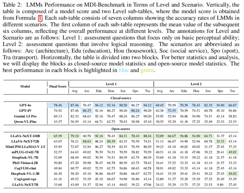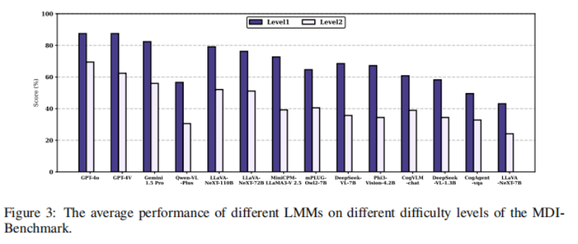 表 2 展示了不同语言模型在 MDI 基准测试中的整体表现。论文发现以下几点: