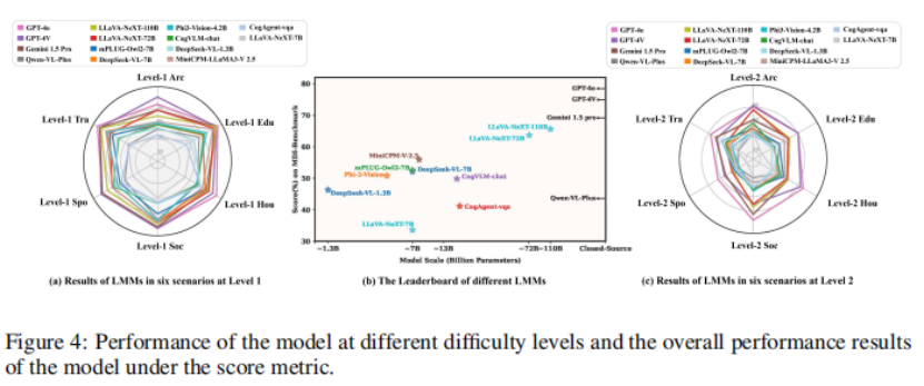 模型性能的规模效应。此外,由于闭源模型数据有限,论文在开源模型中观察到了一些有趣的现象。论文选择了不同规模下表现最佳的开源模型,包括 LLaVA-NeXT-110B、LLaVA-NeXT-72B、MiniCPM-LLaMA3-V 2.5、DeepSeek-VL-7B、Phi3-Vision-4.2B 和 DeepSeek-VL-1.3B。如图 4 所示(不同 LMMs 的排行榜),这些模型的最终得分表明,模型参数越大,其在实际场景中解决问题的能力就越强。这与人类的经验一致:更大的语言模型参数意味着更多的文本逻辑训练样本,减少了模型蒸馏的需要。面对更复杂的逻辑推理任务时,这些模型能够利用更多的底层知识和基本能力。