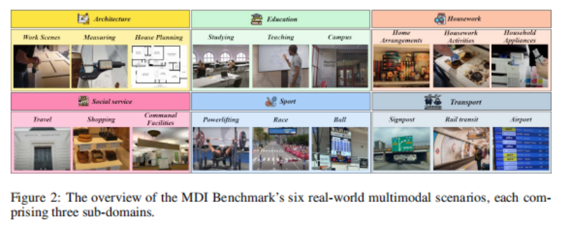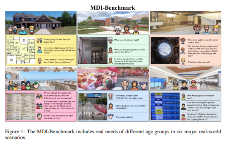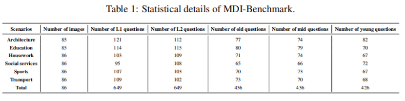 •MDI 基准集包含超过 500 张真实世界图像和 1200 个由人类设计的问题,涵盖了六个真实的多模态场景。每个场景分为三个子领域,每个子领域又分为两个复杂度级别。此外,论文在评估中加入了年龄因素,以帮助 LMMs 为不同的人口群体提供个性化的响应。