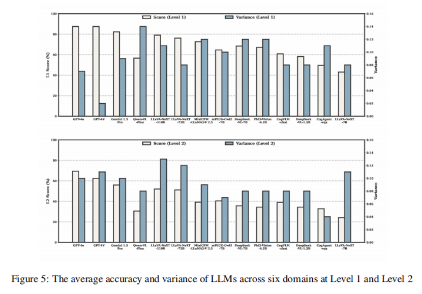 与高级闭源语言模型相比,开源语言模型需要在特定的日常生活能力和复杂问题场景上进行更多的研究,以缩小显著的差距。值得注意的是,如图 5 所示,LLaVA-NeXT-72B 在第 2 级的表现与最优模型 LLaVA-NeXT- 110B 相似,但方差有所减少,这表明通过有效的蒸馏技术实现更好的性能和更小的参数是一个值得进一步探索的领域。