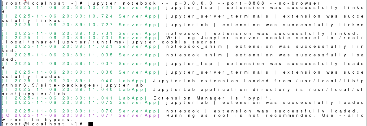 通过执行命令 jupyter notebook --ip=0.0.0.0 --port=8888 --no-browser 完成 Jupyter Notebook 的部署。从日志输出可见,系统成功加载 JupyterLab、终端扩展等各类组件,实现了在 0.0.0.0 网络接口(支持任意设备访问)、8888 端口的无界面启动。该配置为数据科学开发提供了响应迅速、文件操作流畅的 Web 交互环境,可高效开展交互式数据分析、代码调试等工作,是数据科学开发的便捷利器。