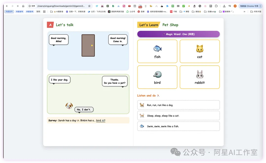 3、它手动写了一堆代码说:“在左边画个 Mike,在右边画个老师”。其实就是在书上的人物、单词位置,盖上一层看不见的透明方块(代码里叫 div)。 设置好“只要点击这个透明方块,就播放声音”。