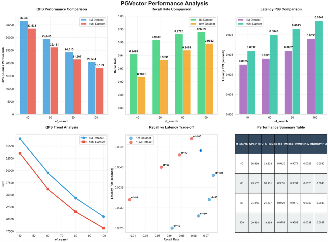 如下是在 Amazon RDS for PostgreSQL db.r8g.16xlarge 规格下使用 VectorDBBench 进行 100 并发线程进行压测,每次压测时长 300s,分别在 Performance768D1M 和 Performance768D10M 两种数据集下,不同 ef_search 下的性能表现: