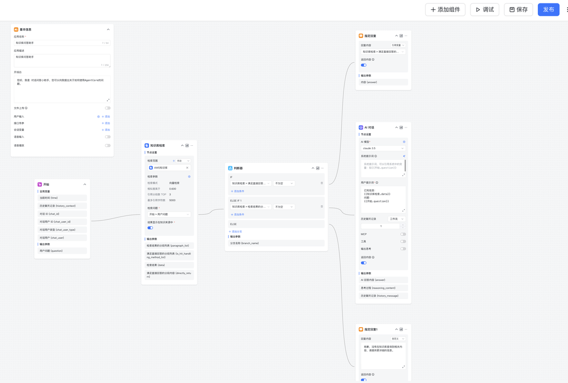 在创建对话助手页面,可以配置对话流程,MaxKB 具有灵活的流程配置功能。配置完成,用户可以针对对话流程进行调试和发布。