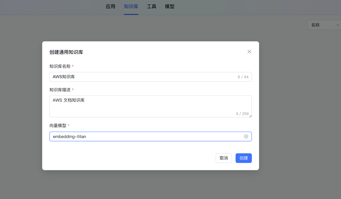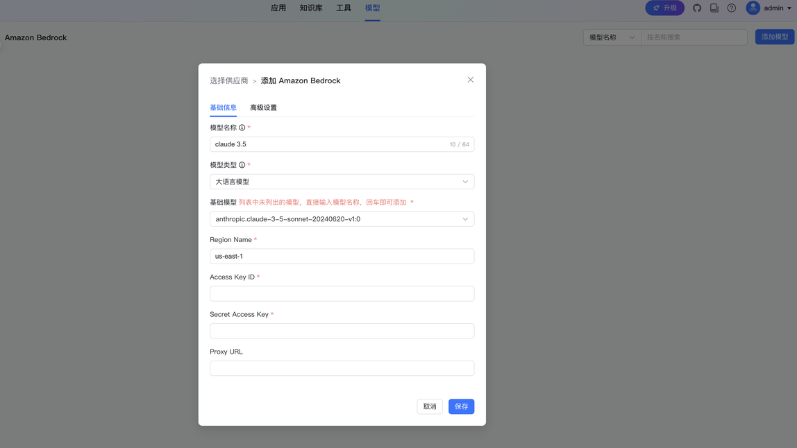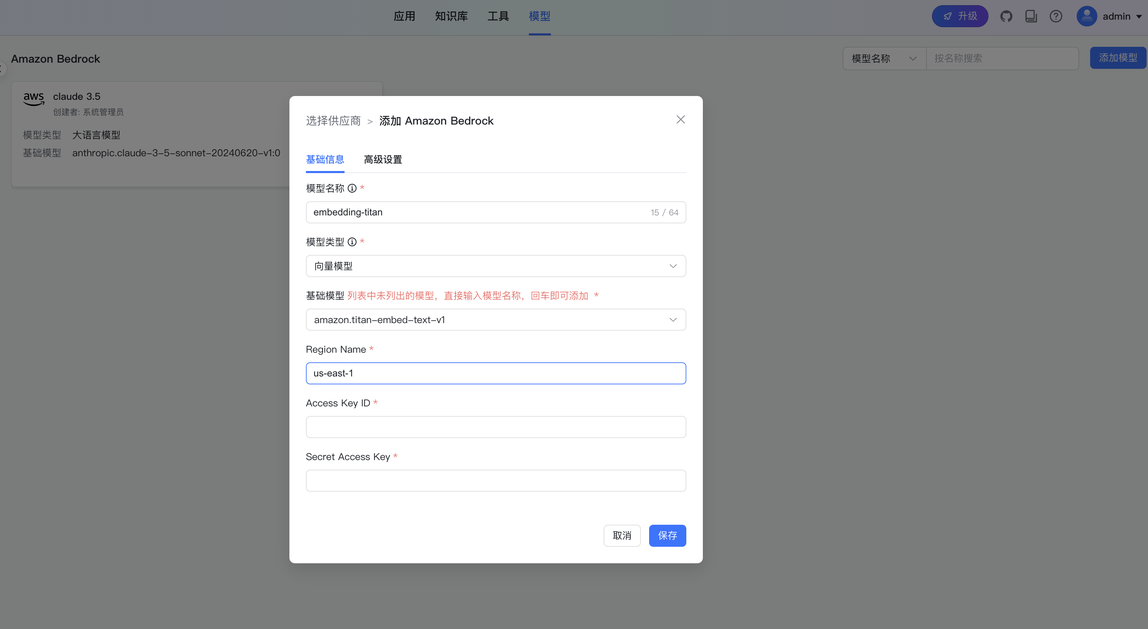 首先需要添加 LLM 模型和 Embedding 模型,MaxKB 支持 Bedrock 模型,可以在模型配置页面进行添加,具体的操作如下: