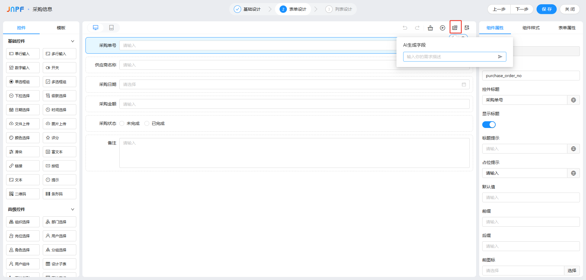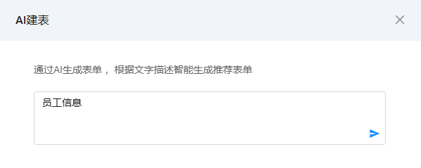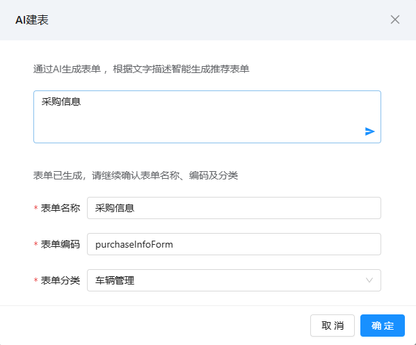 在 “表单设计” 页面点击 “AI 建表”,弹出输入框,填写需求描述(如 “采购信息表,包含采购单号、供应商名称、采购日期、采购金额、采购状态”),文字别超过 100 字(平台限制);
