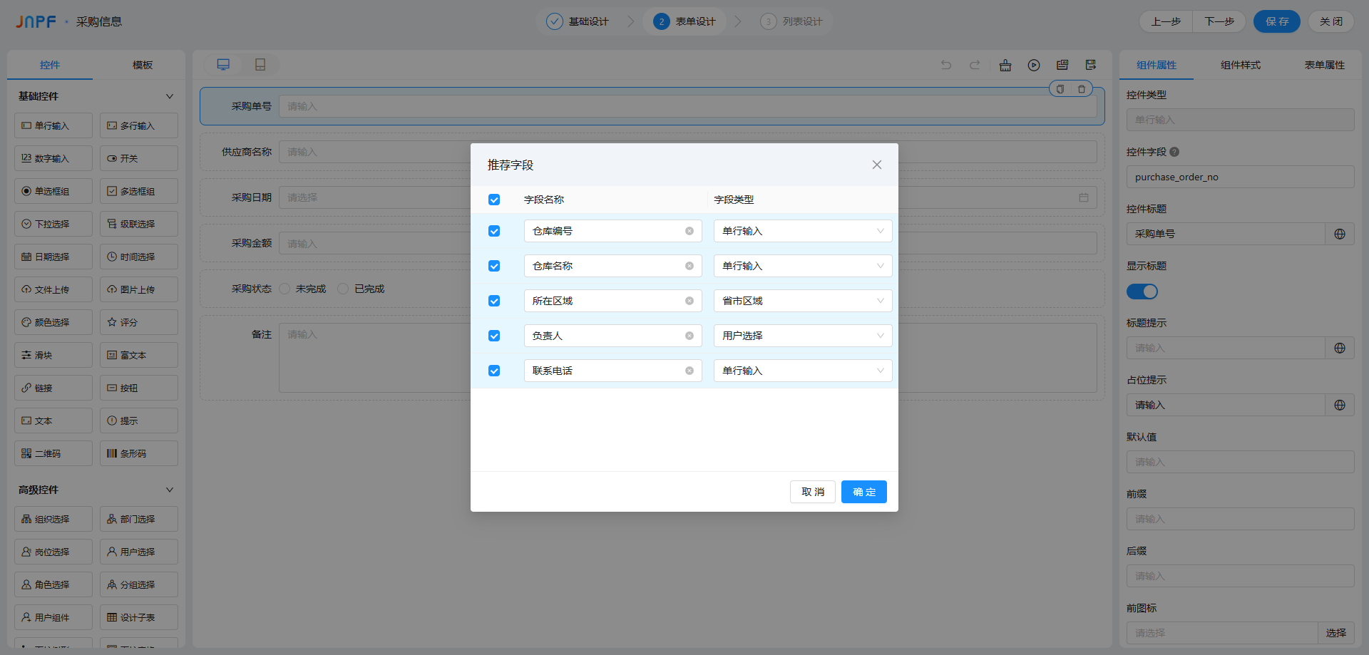 系统会推荐匹配的字段(如 “仓库编号 - 单行输入”“所在区域 - 省市区域”),勾选需要的字段,点击 “确定”,字段会自动添加到画布中;